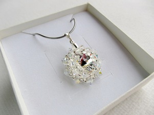 Materiál: Středový kámen tvoří krystal Swarovski rivoli (broušené sklo), okolní kamínky jsou krystaly Swarovski sluníčka Xillion (broušené sklo) a japonské skleněné korálky TOHO. Stříbrná šlupna z bižuterního kovu, řetízek z nerezové oceli.