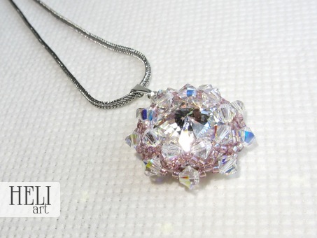 Materiál: Středový kámen tvoří krystal Swarovski rivoli (broušené sklo), okolní kamínky jsou krystaly Swarovski sluníčka Xillion (broušené sklo) a japonské skleněné korálky TOHO. Stříbrná šlupna z bižuterního kovu, řetízek z nerezové oceli.