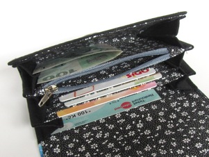 Praktická menší harmoniková peněženka celá zdobená ruční malbou, ušitá z kvalitní bavlněné látky, se zapínáním na magnetický patent. Peněženka dobře drží tvar díky pevné textilní výztuži. Obsahuje kapsu na zip pro mince, přihrádky na karty a přepážky na přeložené bankovky.