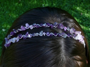 Dvojité kamínkové čelenky vyrábím ze sekaných úlomků minerálů. Každý kamínek má dírku, je navlečen na nerezovém drátku a přidrátován k dvěma vlnkovaným drátům, které jsou spojeny cínem do jedné kompaktní čelenky. Dvojité čelenky jsou ve srovnání s měkkými jednořadými čelenkami podstatně pevnější. Obsahují také dvakrát více kamínků a díky tomu i více váží (cca 30g). Tyto čelenky se dají mírně vytvarovat a přizpůsobit tak velikosti a tvaru hlavy, aby kopírovaly její tvar a netlačily ani nepadaly. Dvojité kamínkové čelenky mají jednu univerzální velikost (37 cm obvod), která je určená pro všechny věkové kategorie (cca od 5 let). Tyto čelenky sluší i krátkovlasým ženám, které si je mohou vzít třeba na slavnostní příležitosti jako netradiční ozdobu.