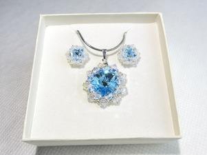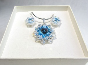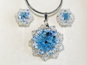 Materiál: Středové kámeny tvoří krystaly Swarovski rivoli (broušené sklo), okolní broušené kamínky jsou krystaly Swarovski sluníčka Xillion (broušené sklo) a nakonec japonské skleněné korálky TOHO. Přívěsek je uchycen pomocí šlupny z bižuterního kovu a zavěšen na řetízku z nerezové oceli. Náušnicové puzety jsou vyrobeny z bižuterního kovu s kvalitní porvchovou úpravou rhodium.